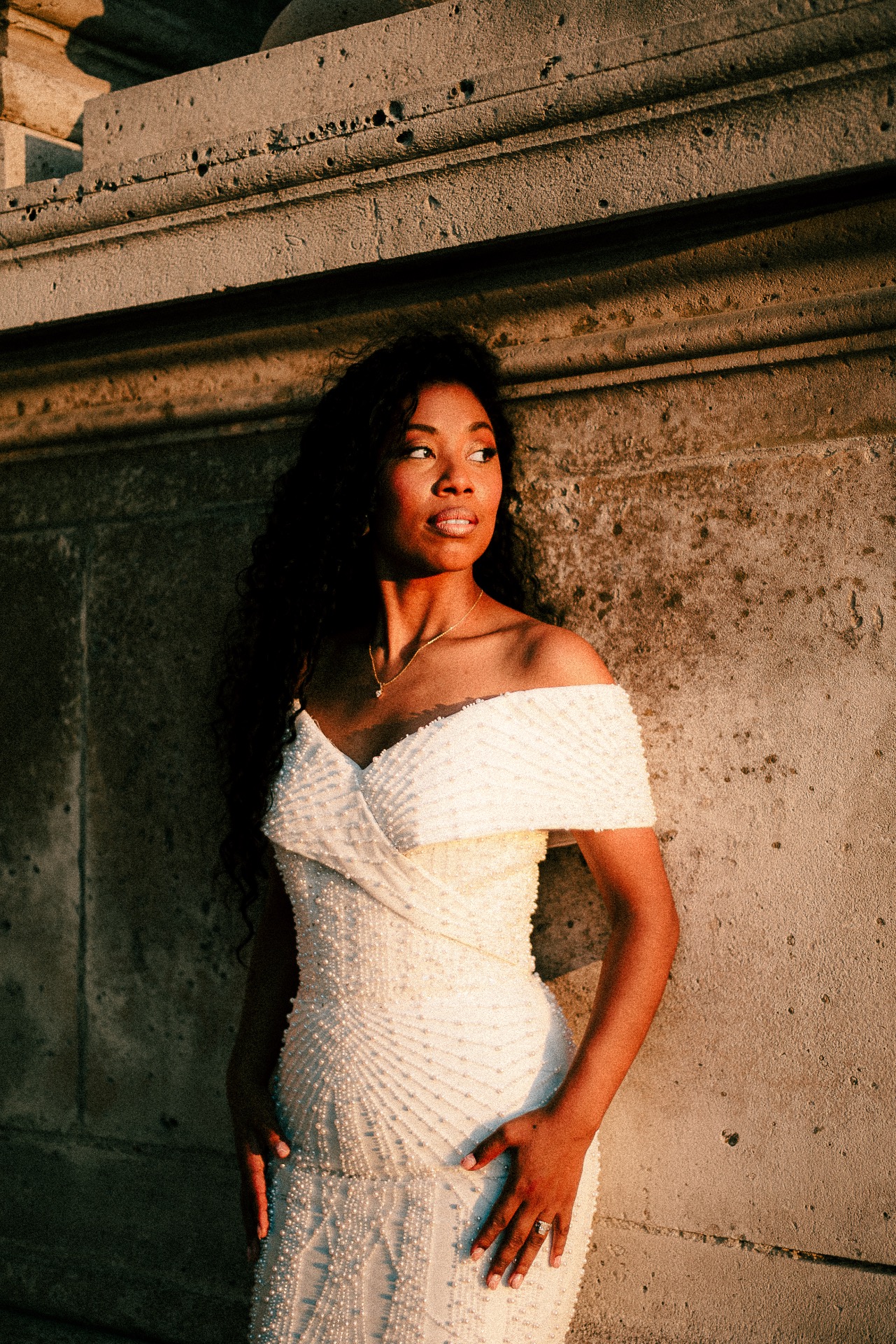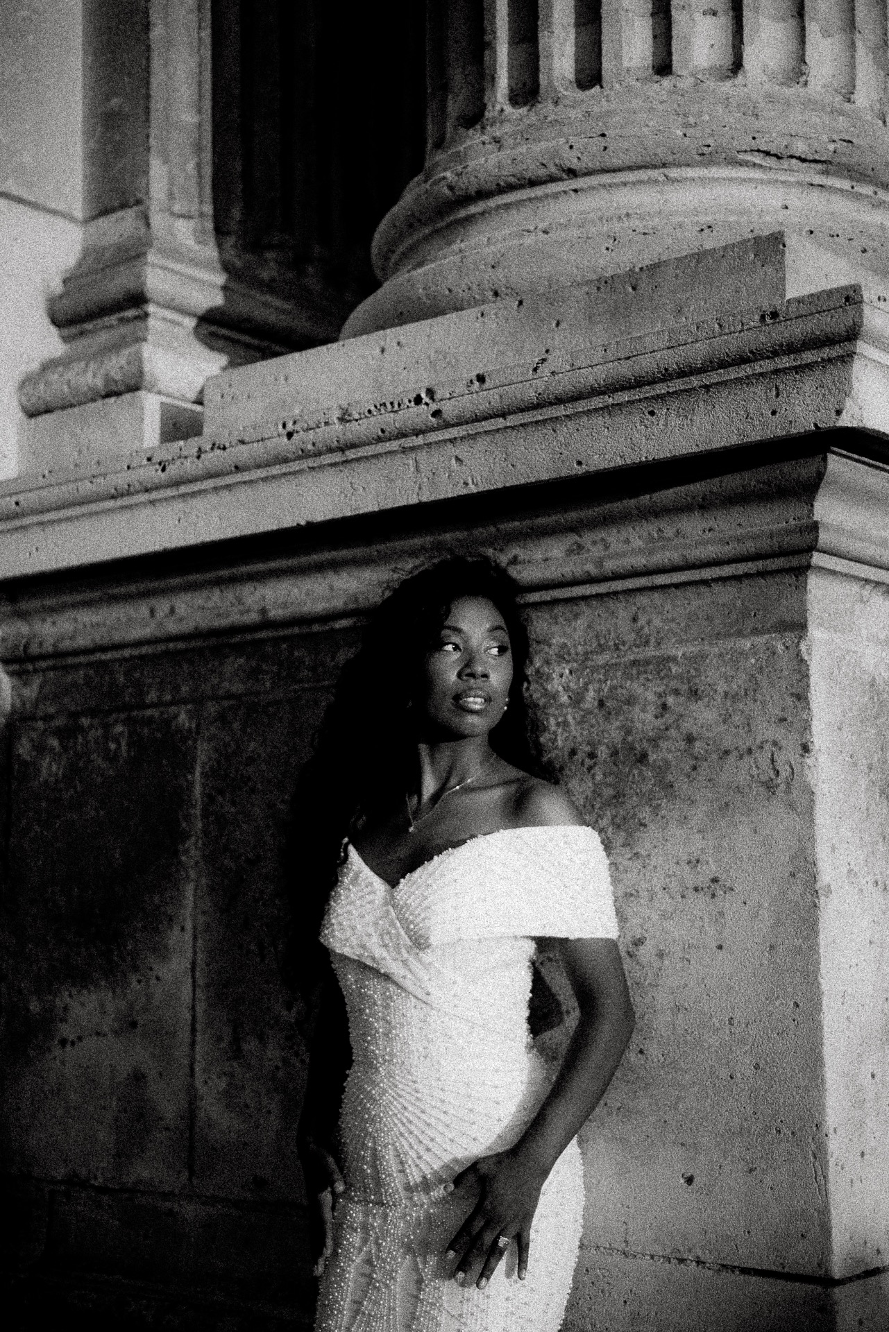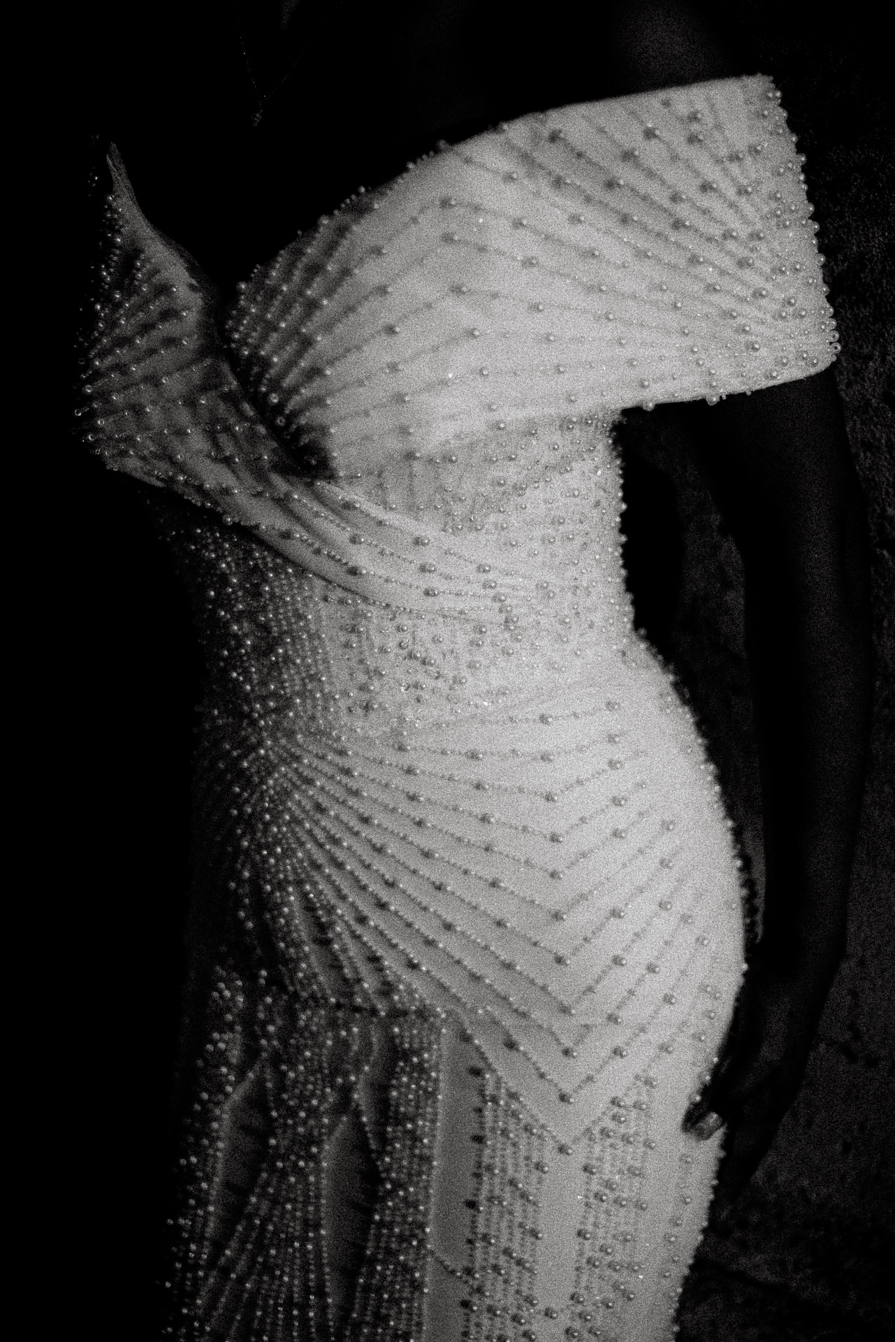 Son perlage géométrique rappelle les robes haute couture des grandes maisons parisiennes, mêlant sophistication sculpturale et grâce intemporelle.