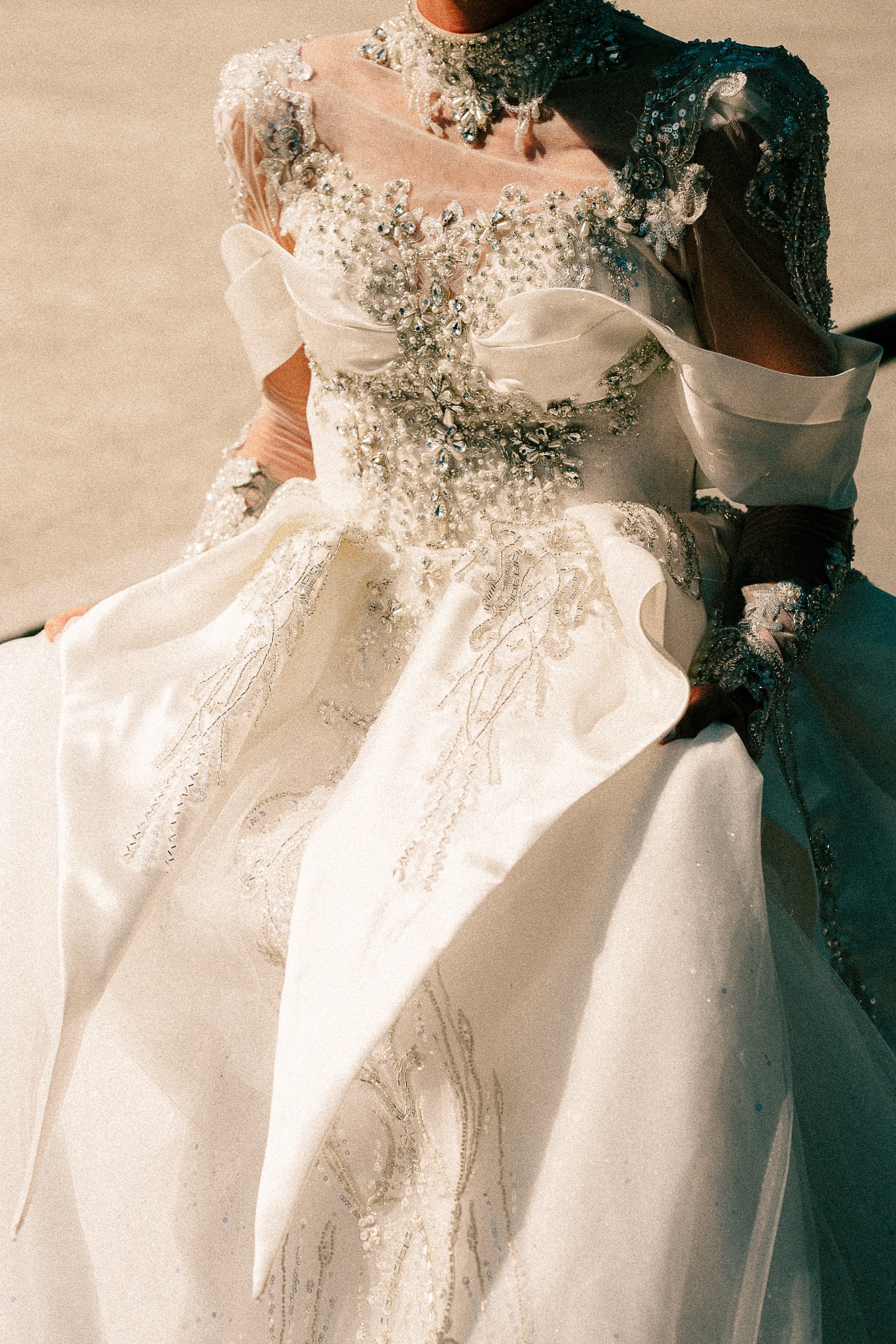 La robe "Impériale" incarne l'élégance théâtrale et la noblesse des mariages royaux, tout en célébrant la féminité avec une modernité précieuse.