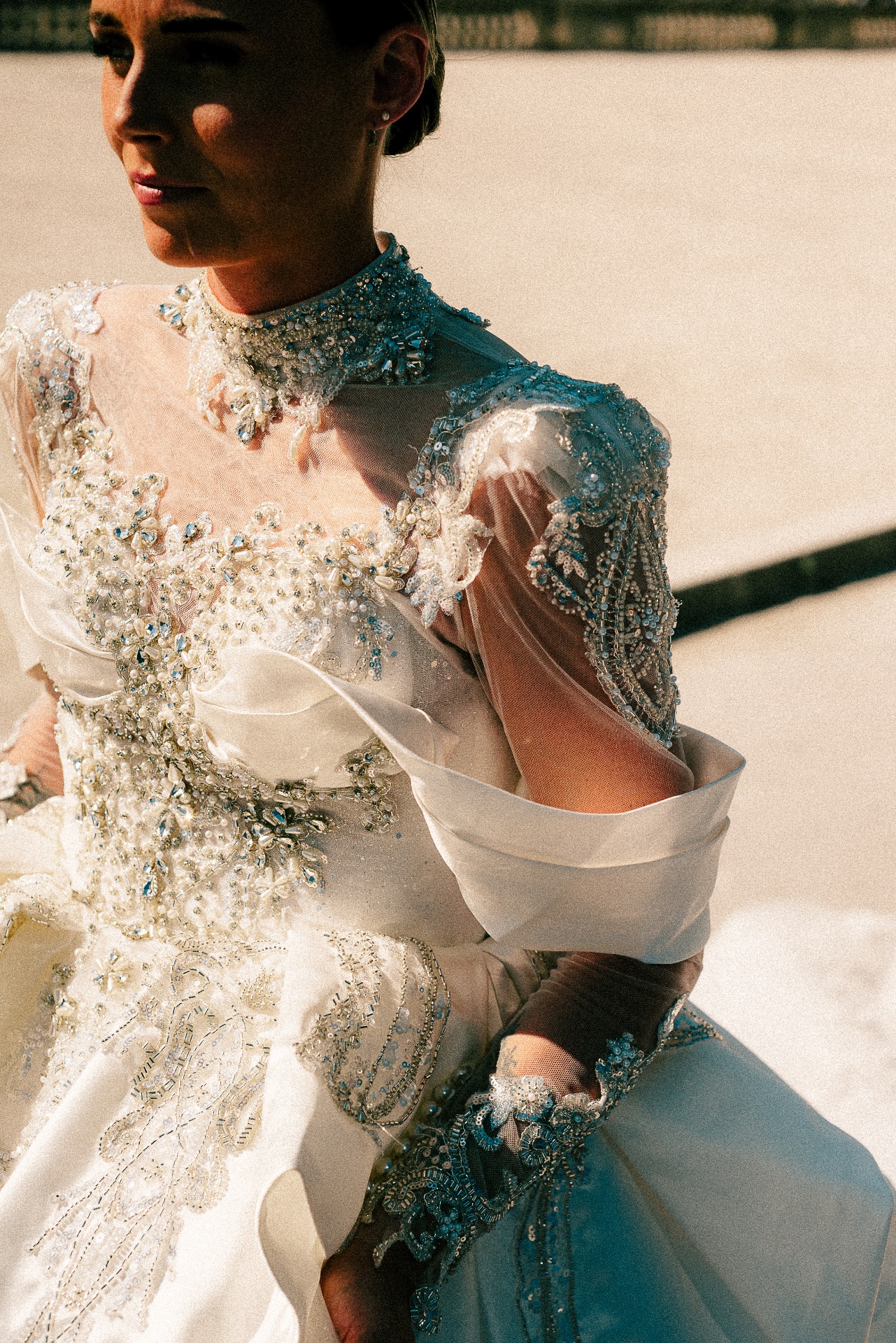 Inspirée des reines de l'Europe impériale, cette création unique mêle tradition et modernité. Chaque détail est pensé pour capturer la lumière, la grâce et l'émotion d'un moment inoubliable. C'est une robe qui impose le silence, émeut, et sublime la mariée comme une œuvre d'art vivante.
