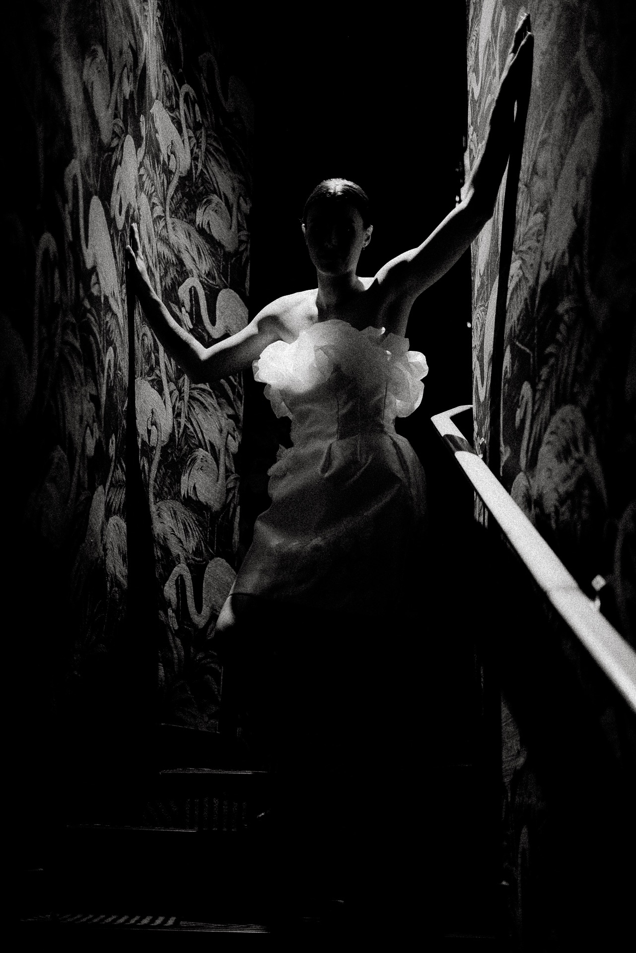 Sa structure impeccable et ses pétales vaporeux en organza créent un contraste couture qui rappelle les plus belles pièces des ateliers parisiens :