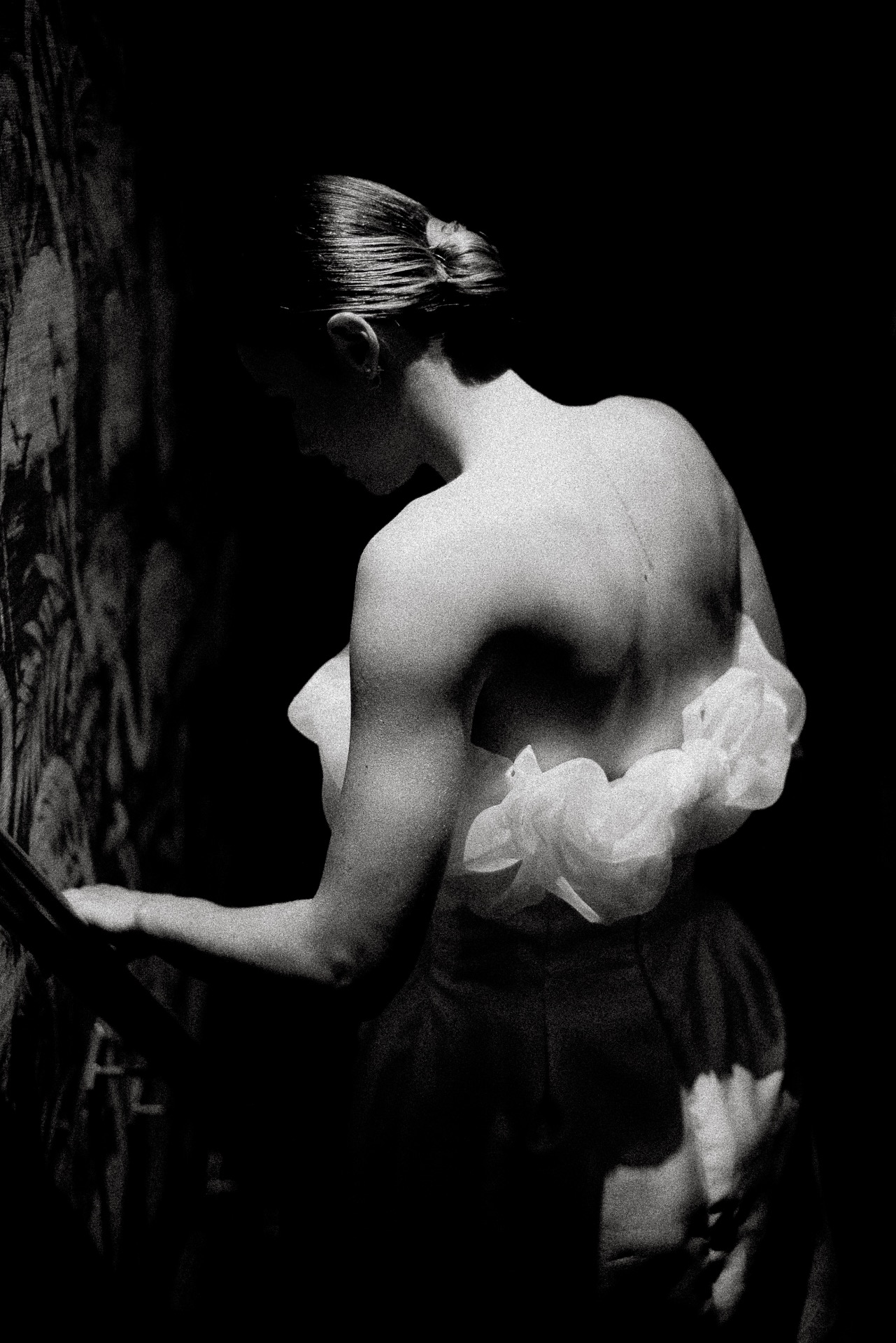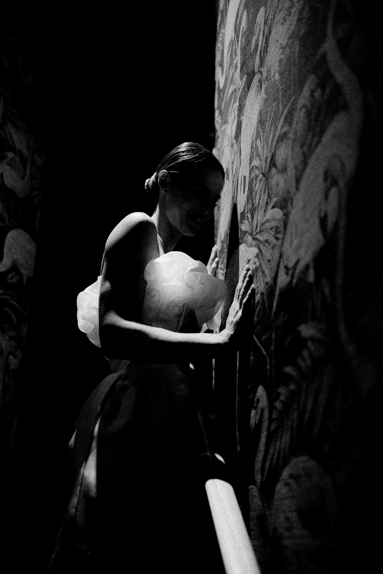 Volutes d'organza de soie façonnées à la main, formant un nuage floral en relief sur le buste et au dos : aérien, délicat, résolument poétique.